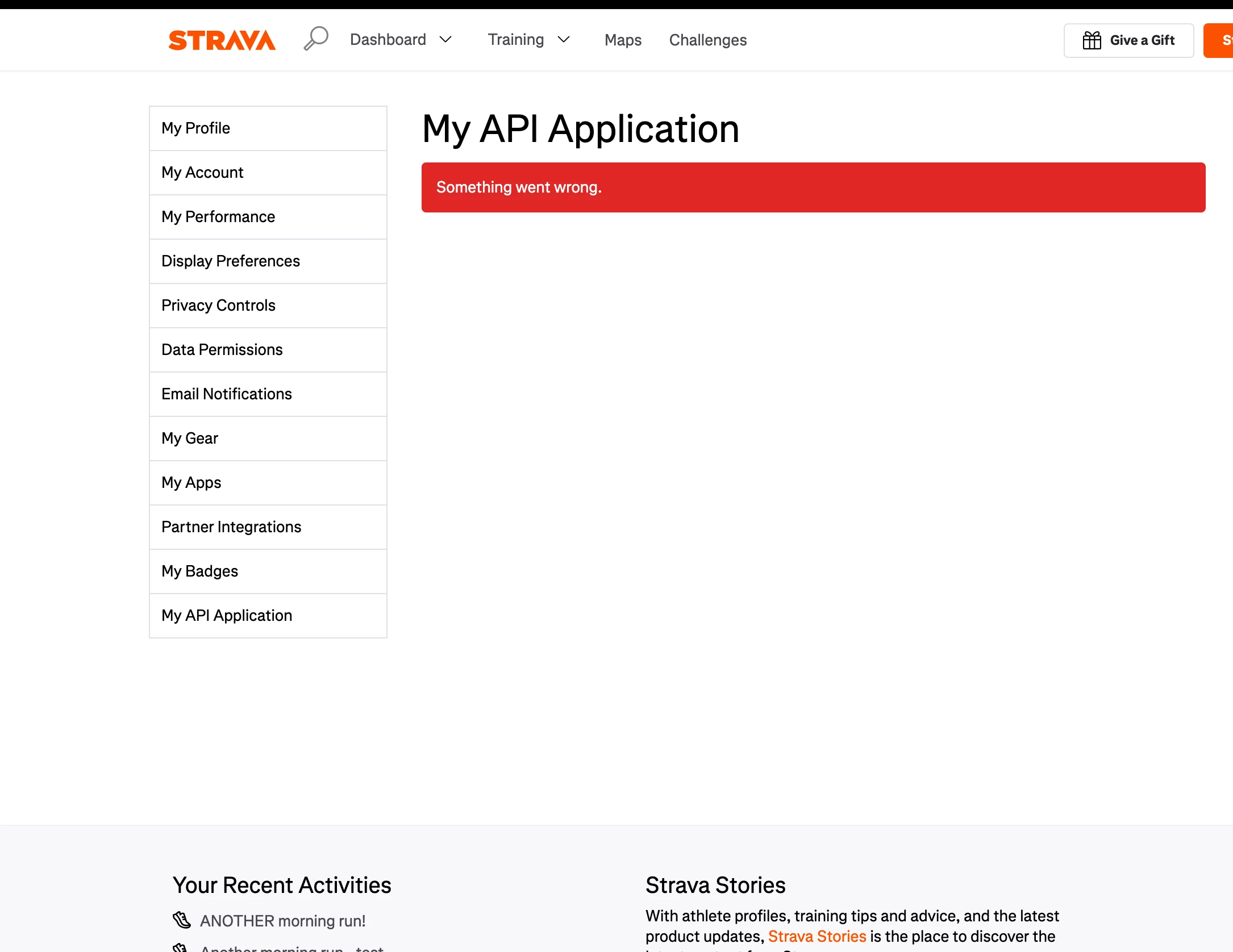When navigating to the “My API Application” or settings/api page on the Strava web app I receive an error that I cannot bypass. I’ve verified this happens on multiple different browsers (arc, zen, chrome) as well as for multiple different strava accounts I have.