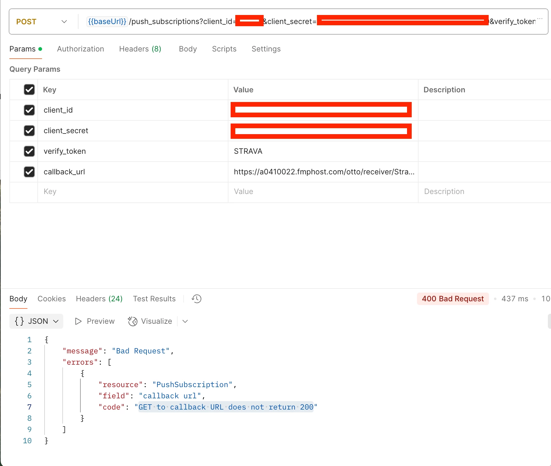 Why is the /push_subscriptions POST throwing back an error that the callback URL “GET to callback URL does not return 200”?