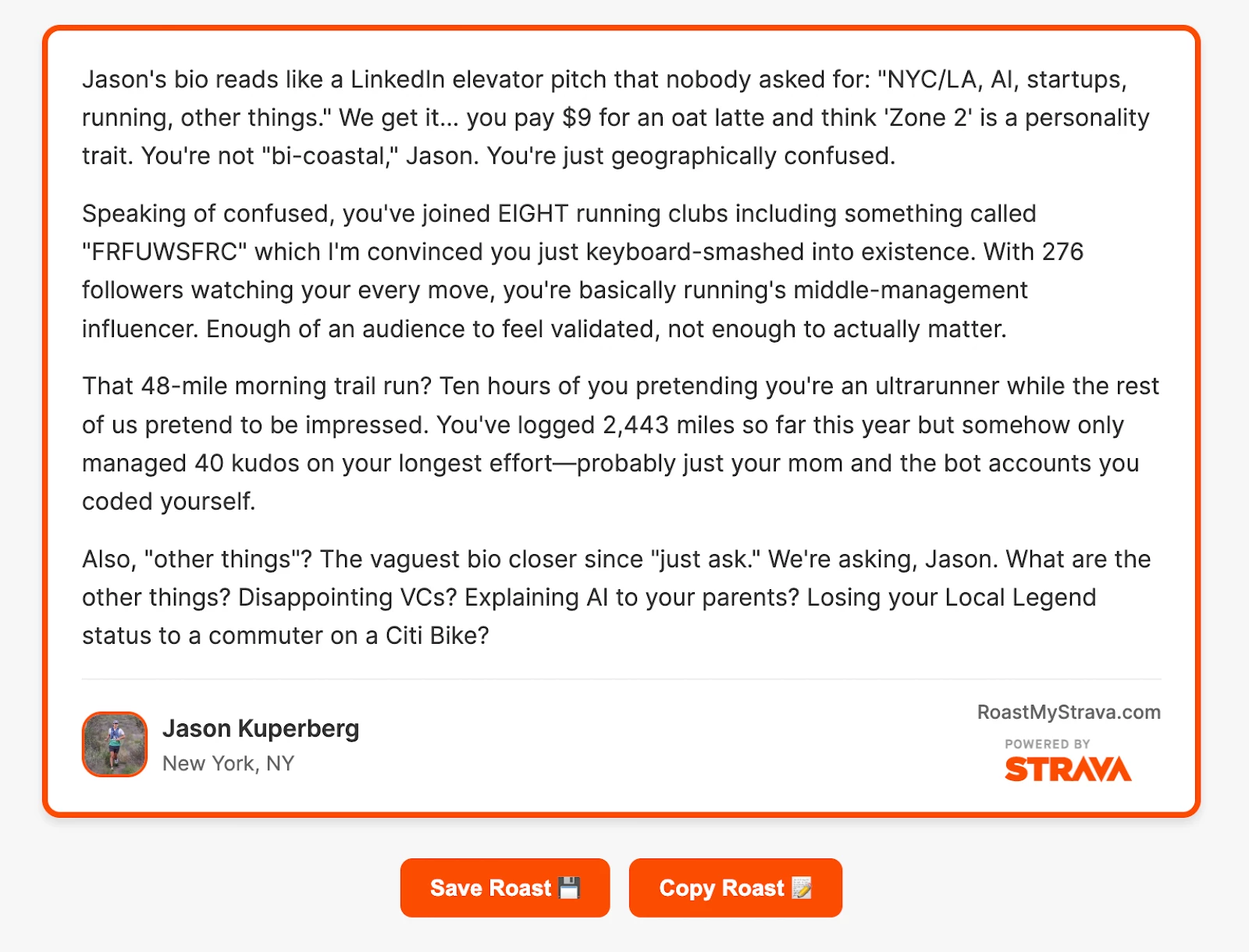 If you haven't tried it yet, I'd love to roast your Strava. And if you're building something, or just want to see my latest run get roasted, find me on Strava.
