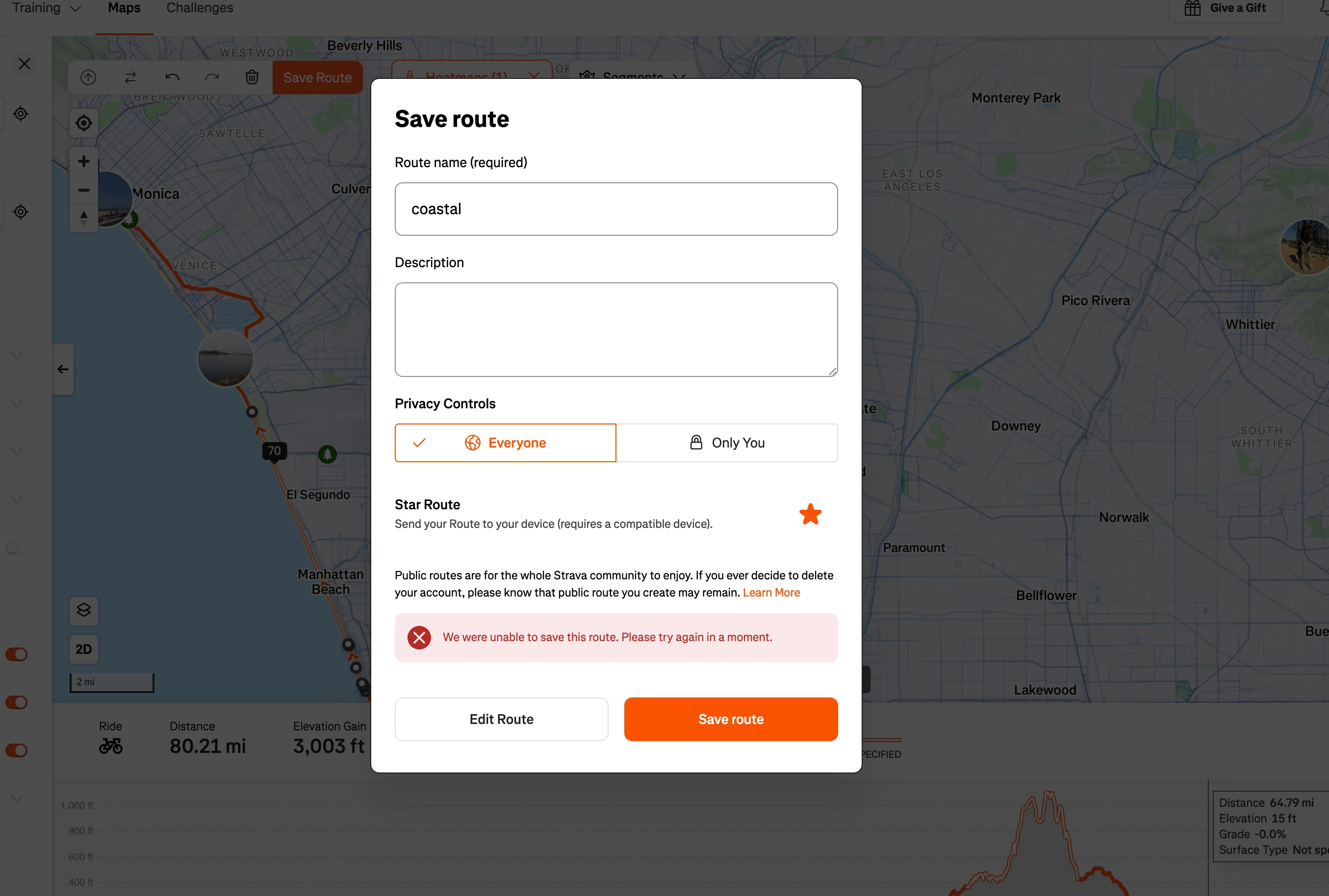 App cant save a route through a high-traffic path. tried more/less waypoints, manual mode, popular waypoints, restarted computer, power cycled the modem and router, route building is near unusable at the moment.