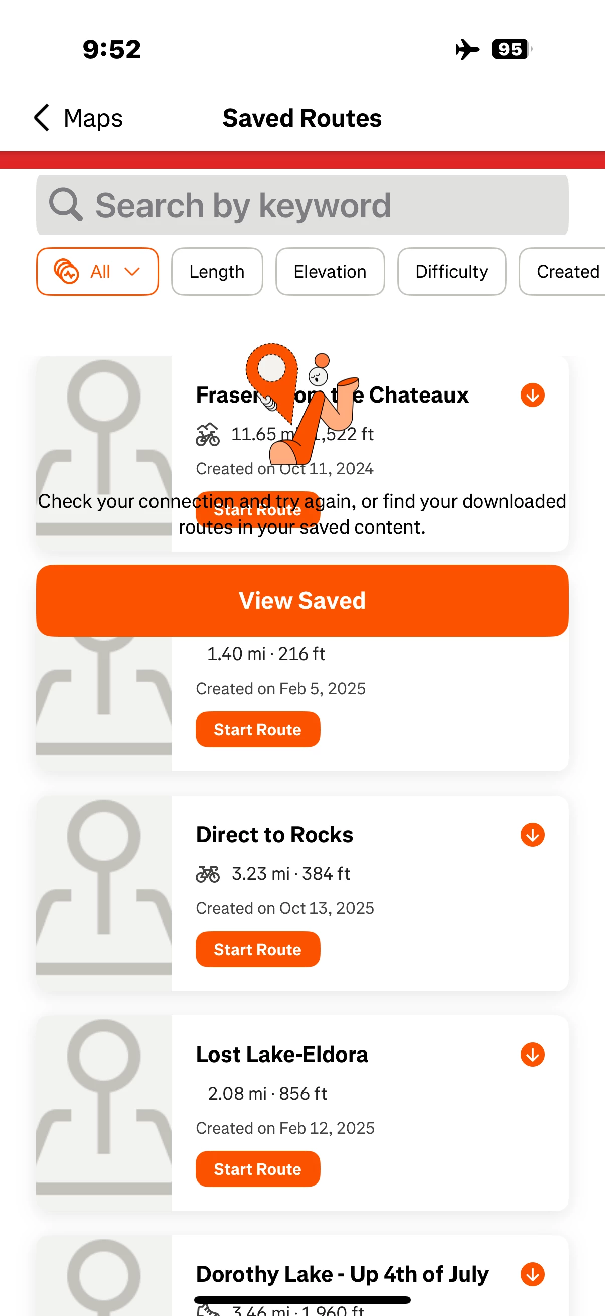 As I have seen in previous posts several months ago, I cannot access offline maps. Yes, I have save and downloaded the maps. Yes, I have the latest version of Strava 432.0.1. When I am off line, all I see is what's in the screenshot below. The View Saved button is dead. Am I missing where my Saved Content is?