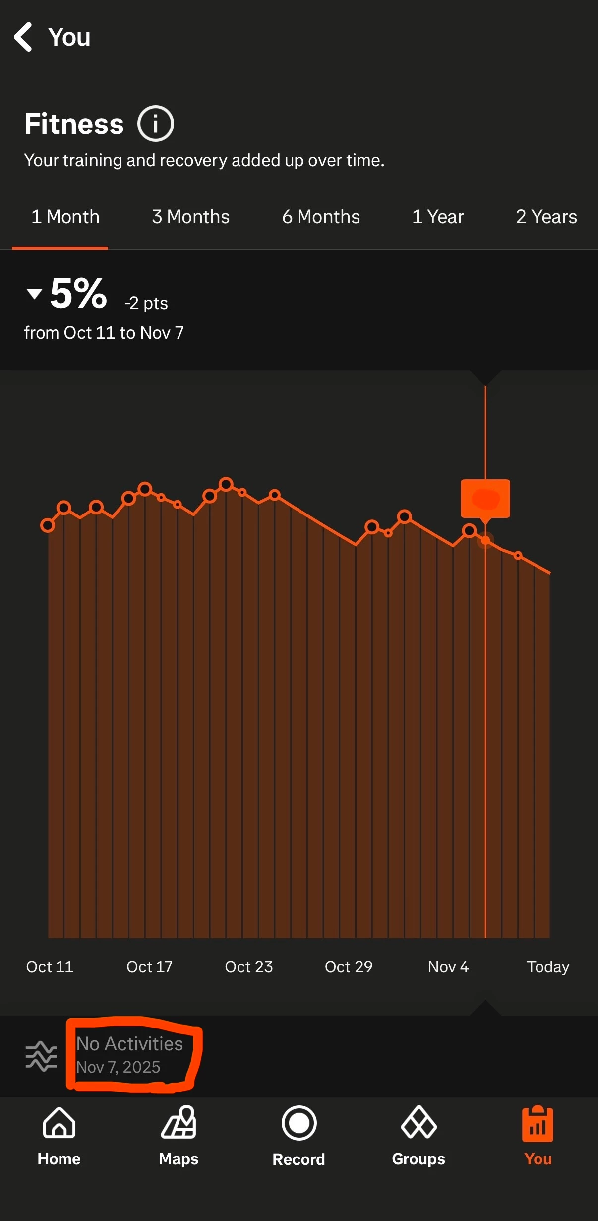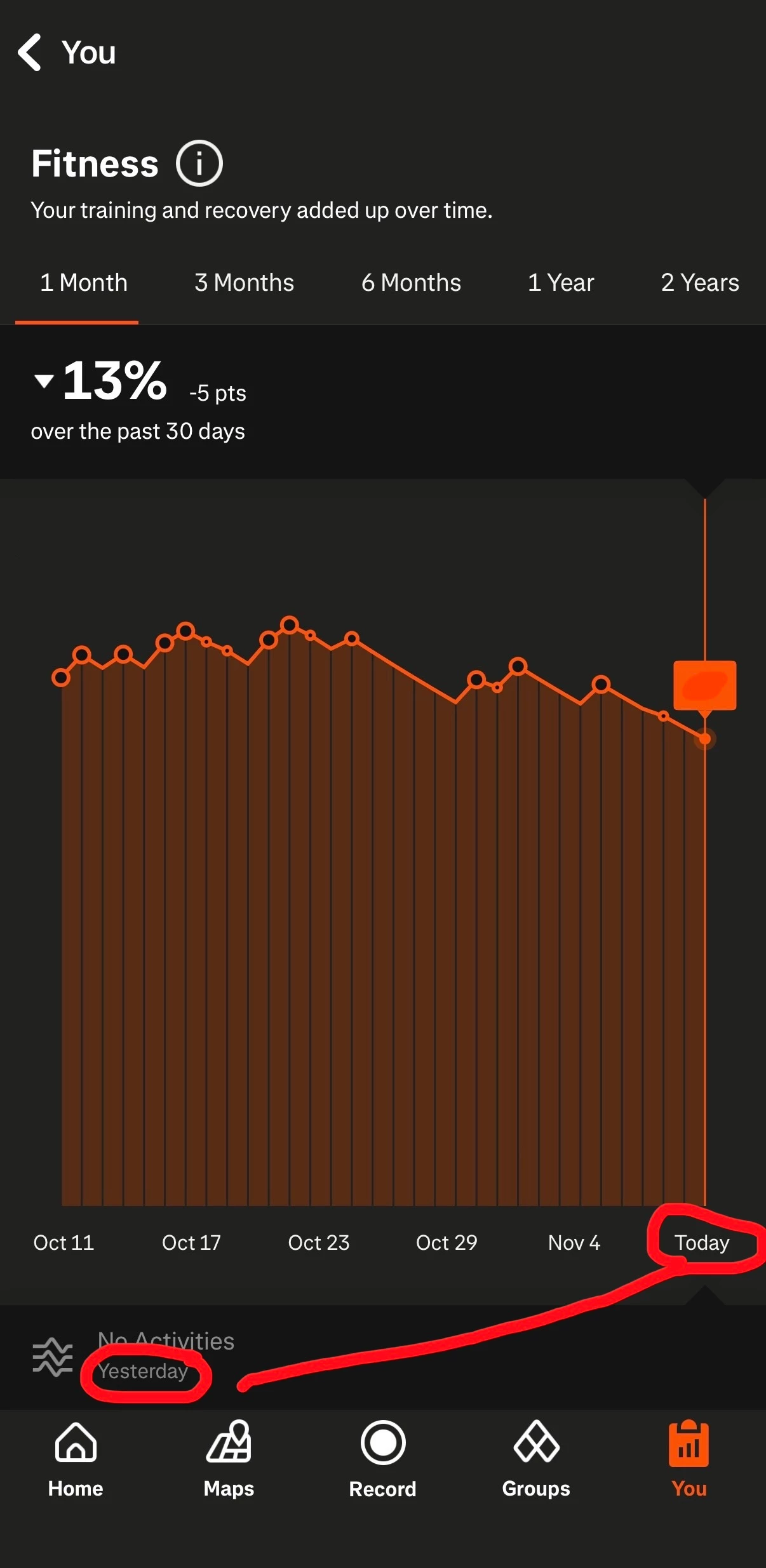 Fitness Score doesn’t seem to take into account Strava App activities (ones I only log from the Strava App on my phone) vs those I log on my Garmin and import into Strava. Eg Nov 7 activity from Strava App is not part of Fitness Score in the screenshots.