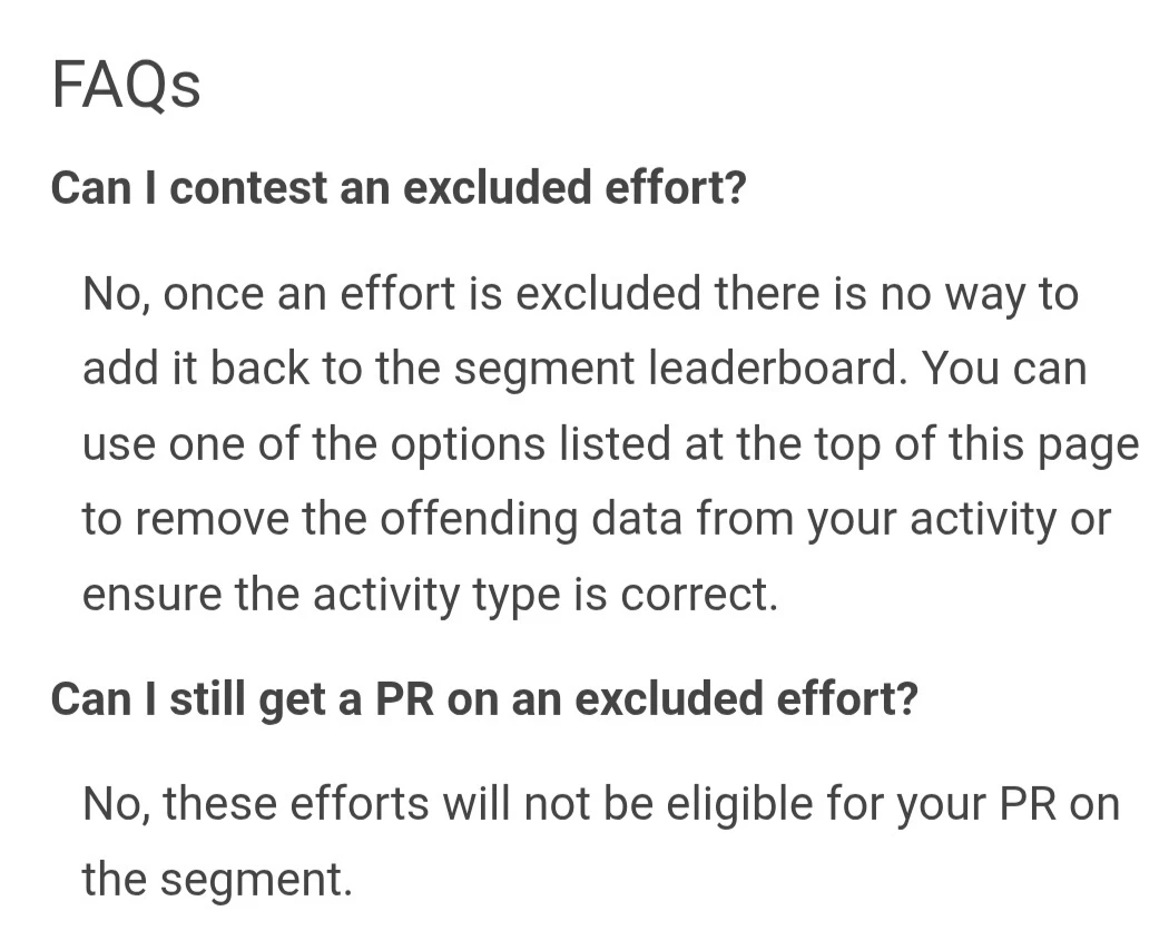 I recently discovered I no longer have a QOM Segment of a 90km cycle recorded with the reason being auto excluded as deemed unlikely when this is not the case. I wanted to make Strava users, subscribers and potential future subscribers aware. With data recording capabilities of Strava there should be a resolution for users who have had their best efforts unfairly excluded reinstated. Strava have created a platform whereby these efforts and challenges can be created and competed to display with pride to have it removed unfairly is shameful especially in instances where users may have only had one opportunity and unable to repeat. Support has repeatedly given above reply where I would implore Strava to facilitate reinstatement or remove auto exclusion and allow easier user reporting facility within community to have actual inaccurate recordings removed from leader boards.Â