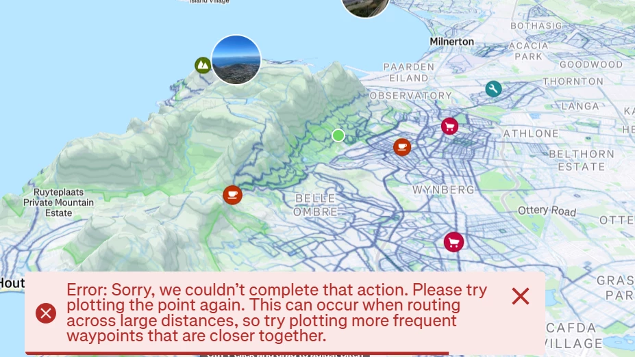 I’m trying to edit a new route and most (but not all) actions I try result in: “Error: Sorry, we couldn’t complete that action. Please try plotting the point again. This can occur when routing across large distances, so try plotting more frequent waypoints that are closer together.”